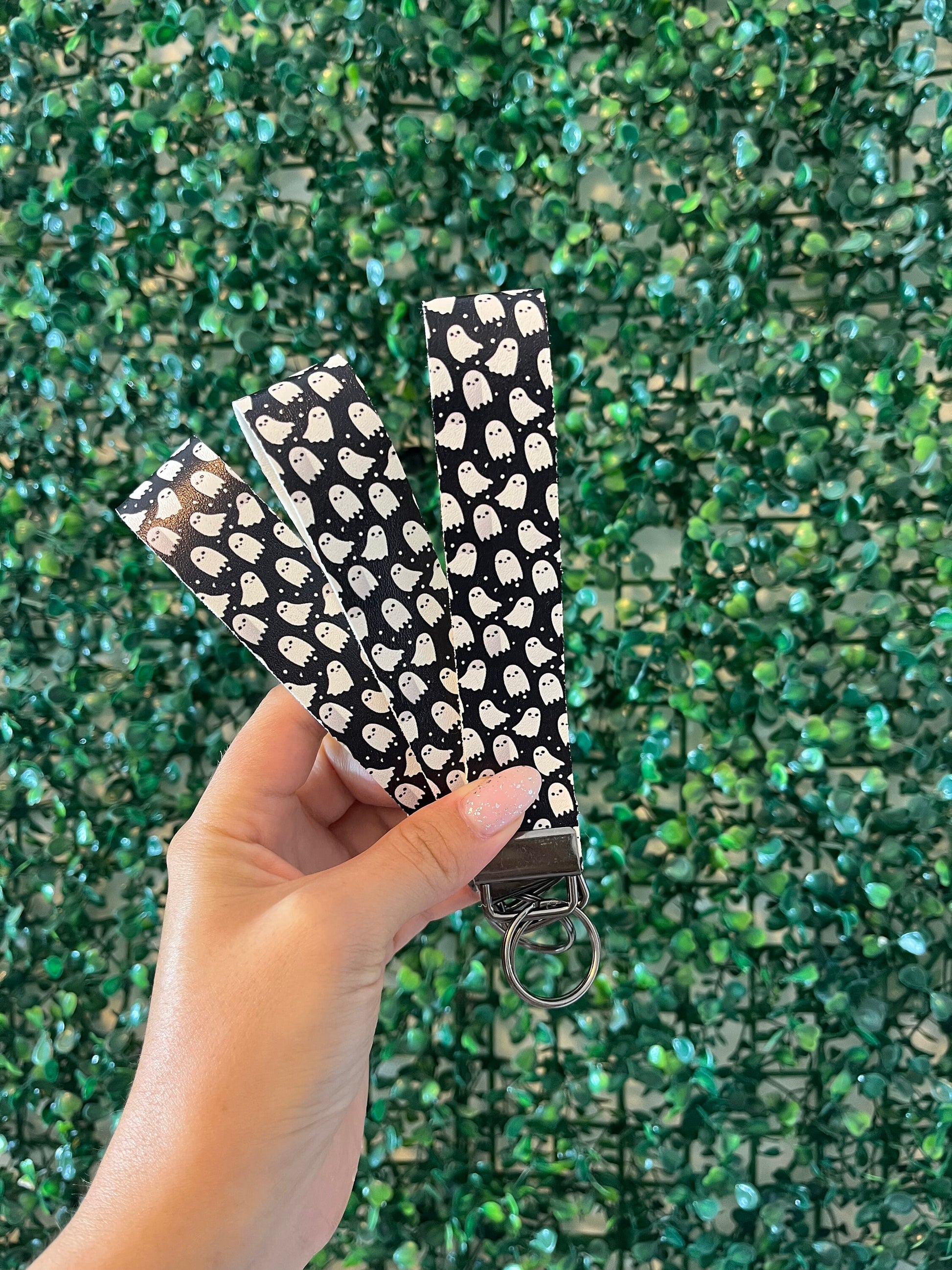 Black and white spooky ghost Halloween keyring wristlet key fob charm.