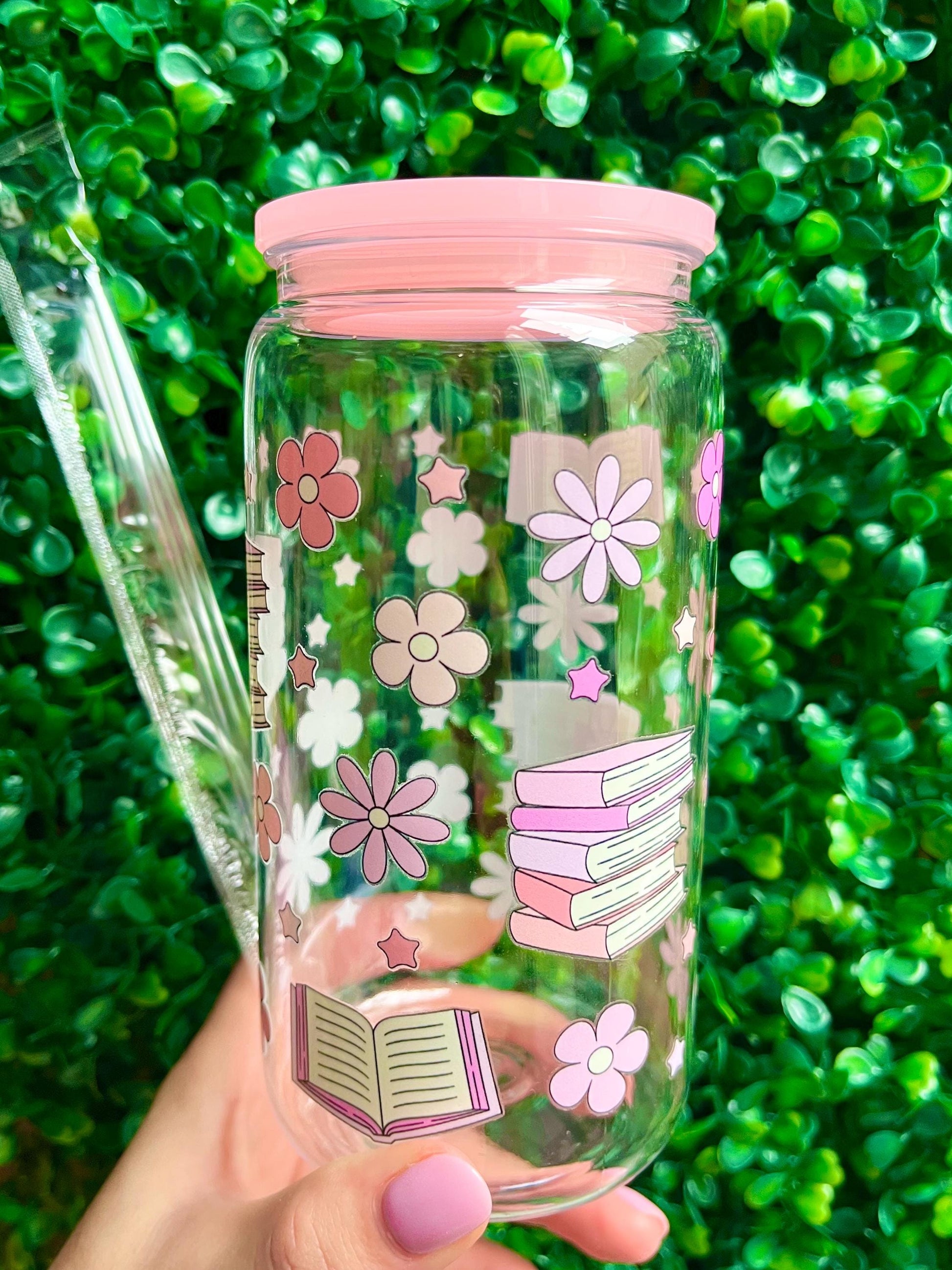 Girly pink and pretty book and flower illustration 16oz plastic acrylic libbey cup tumbler with straw.