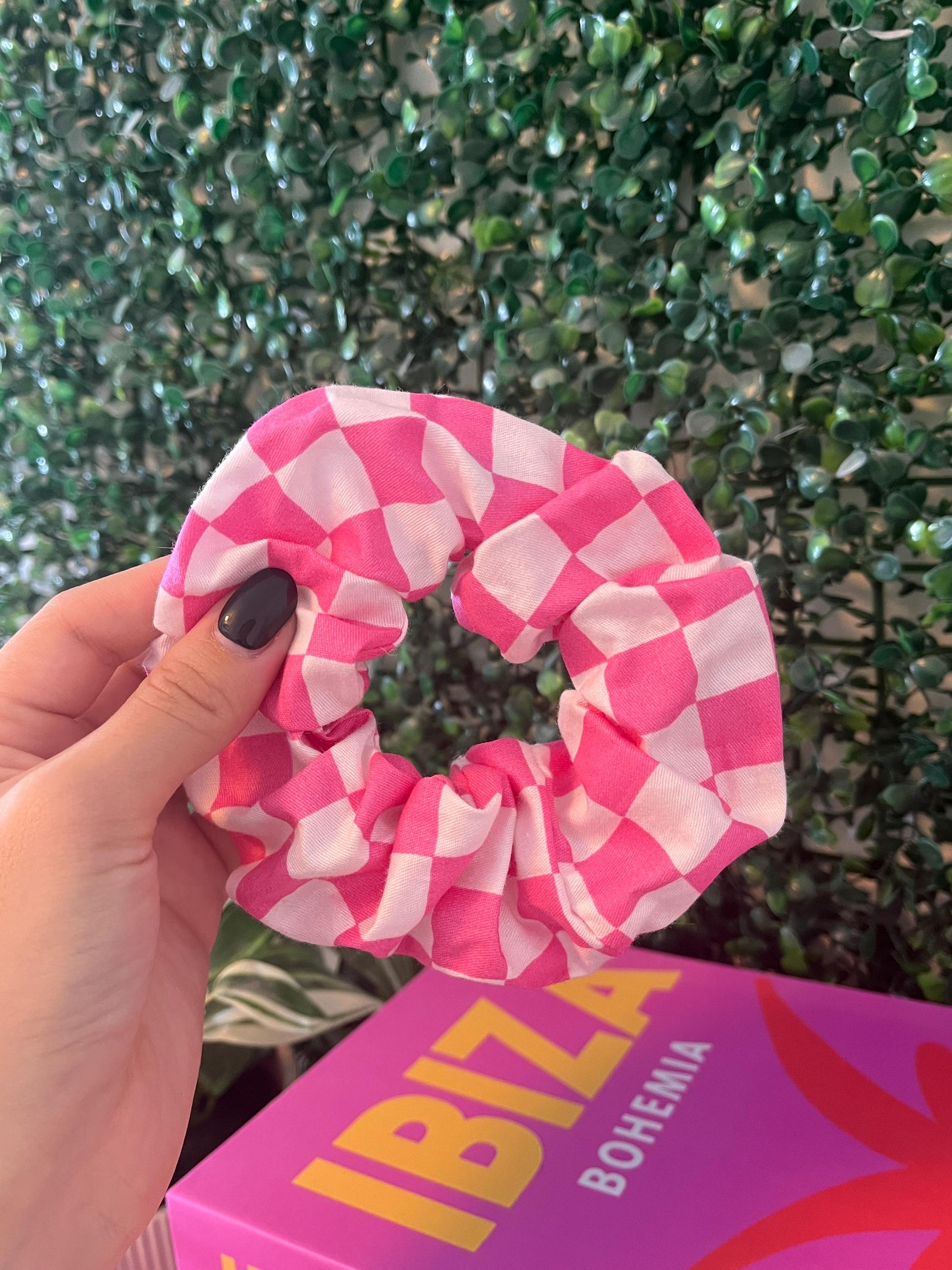 Handmade colourful pink, green, black and white checkerboard scrunchie hair tie elastic for thick hair.