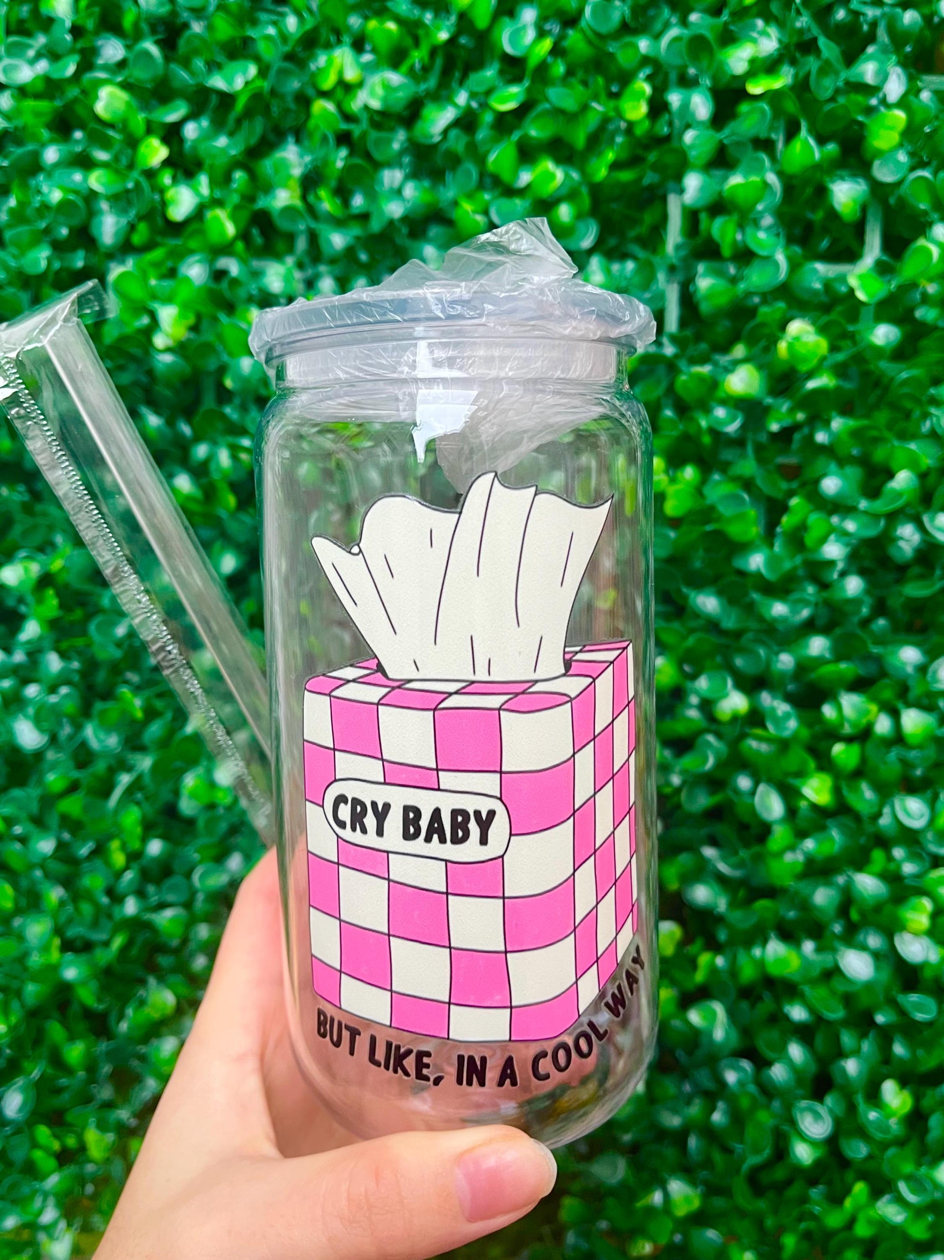 Pink, white and black checkerboard cry baby 16oz plastic beer can tumbler cup with coloured lid and reusable plastic straw.